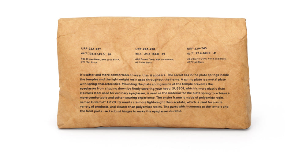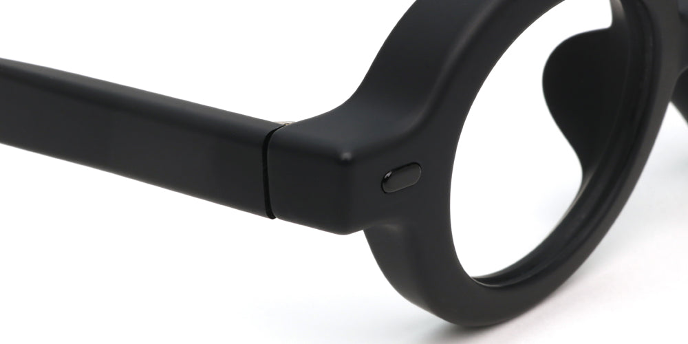 The light resin material TR-90 is used, and a portion of the inside of the front side is cut away to achieve a light and comfortable fit in spite of the extra-thickness of the frame. The hinges are made with a robust and sturdy seven-piece hinge. In addition, the plate springs built into the temples hold the head firmly in place and prevent it from shifting.